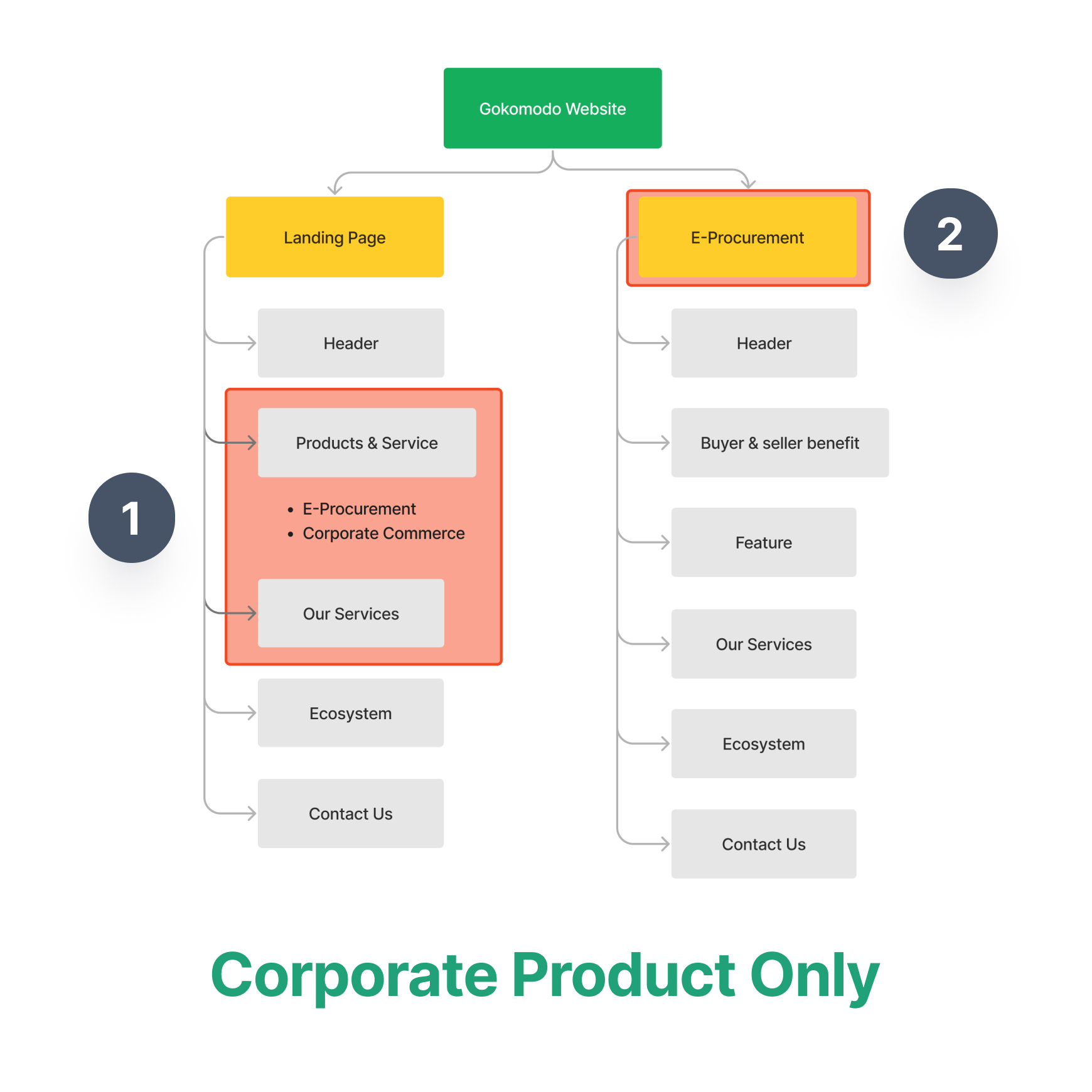 - The website currently only showcases corporate product highlights (E-Procurement & Corporate Commerce) with details on E-Procurement products only.