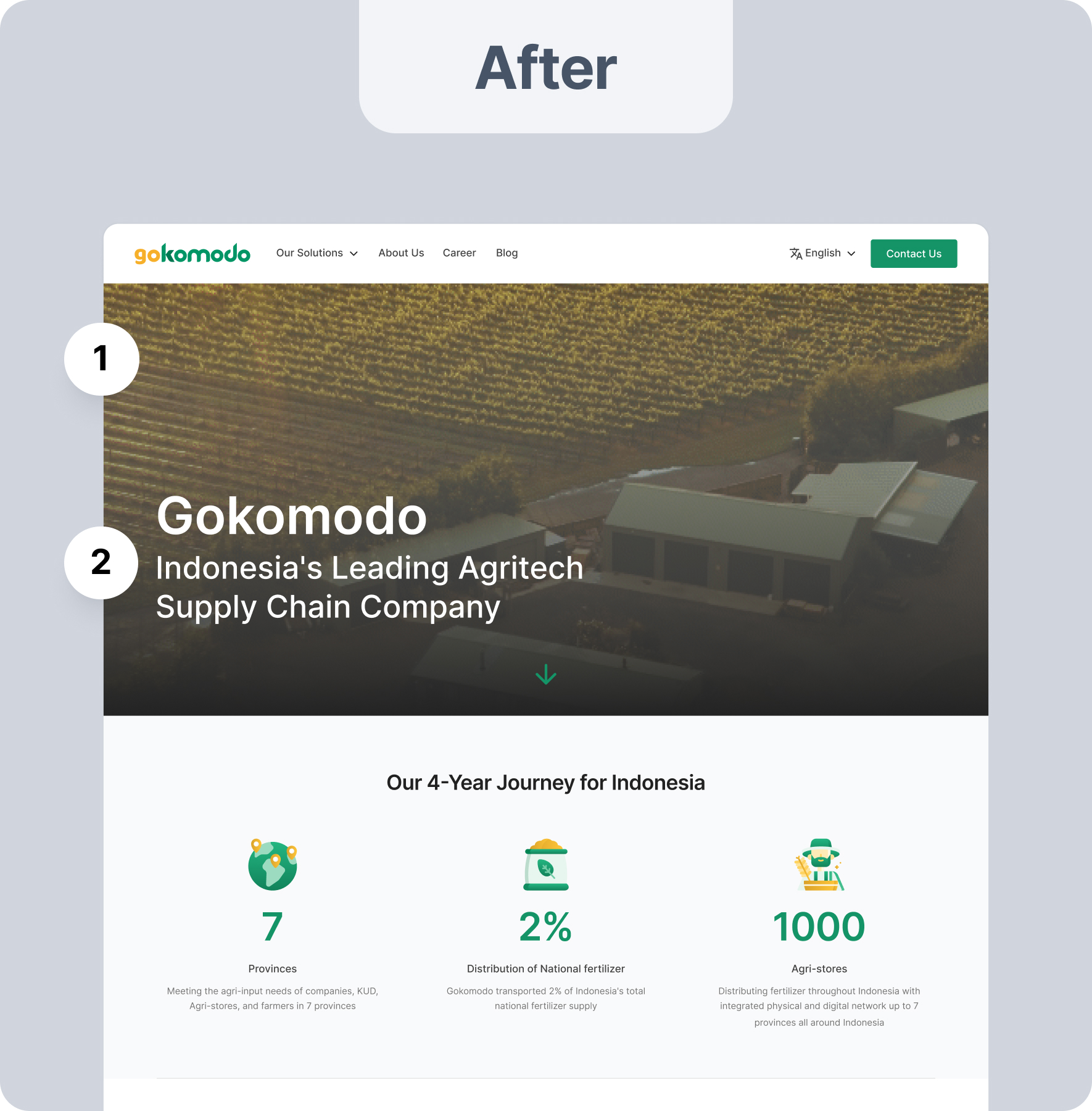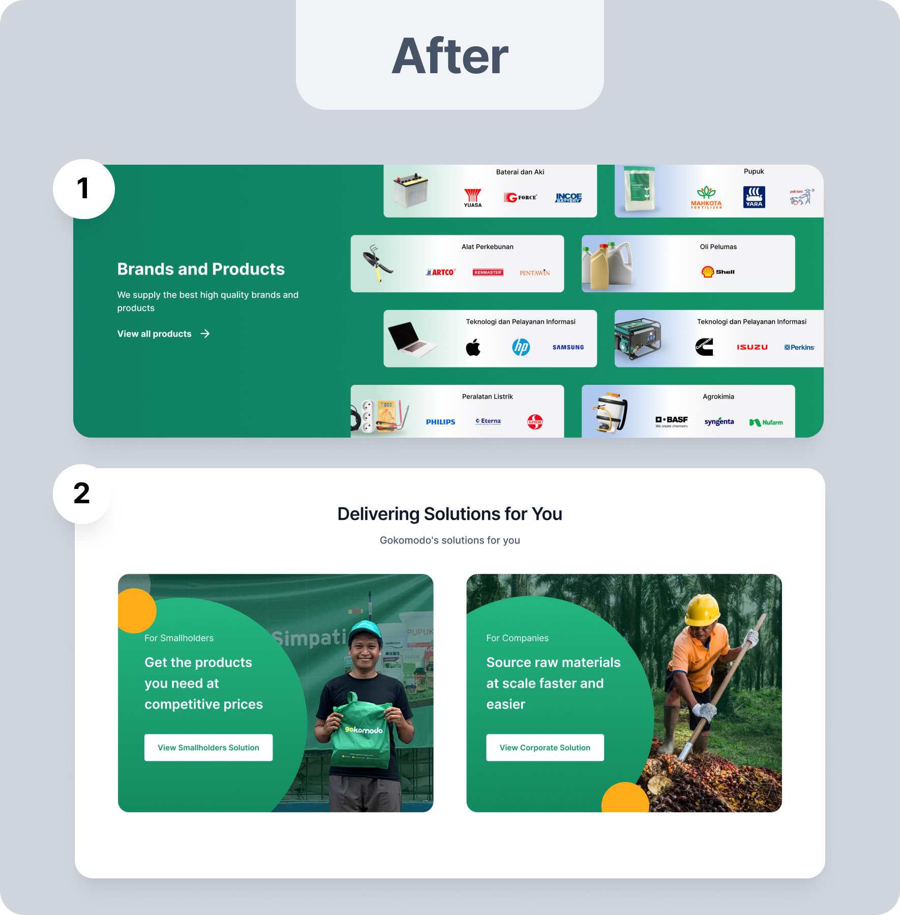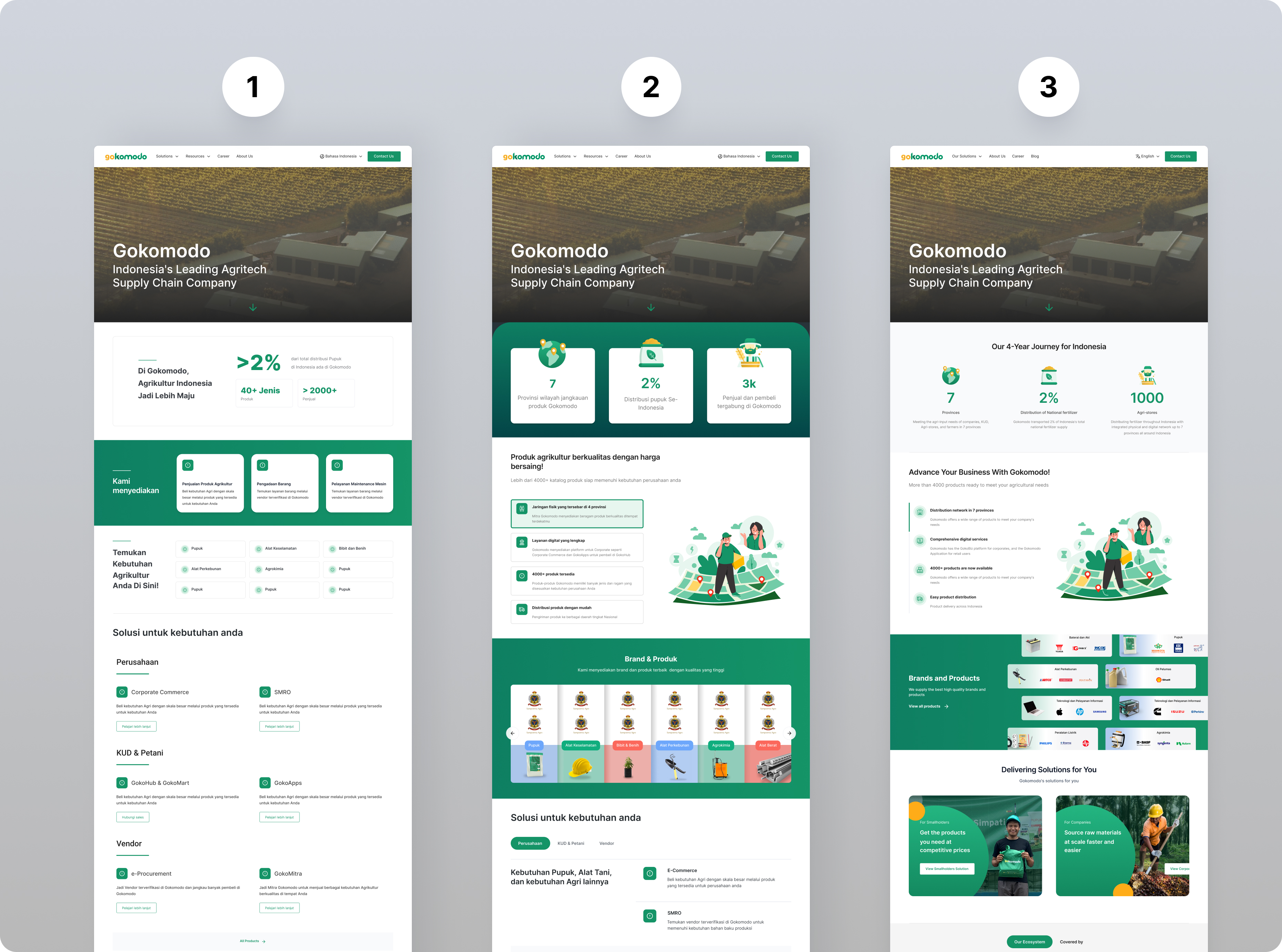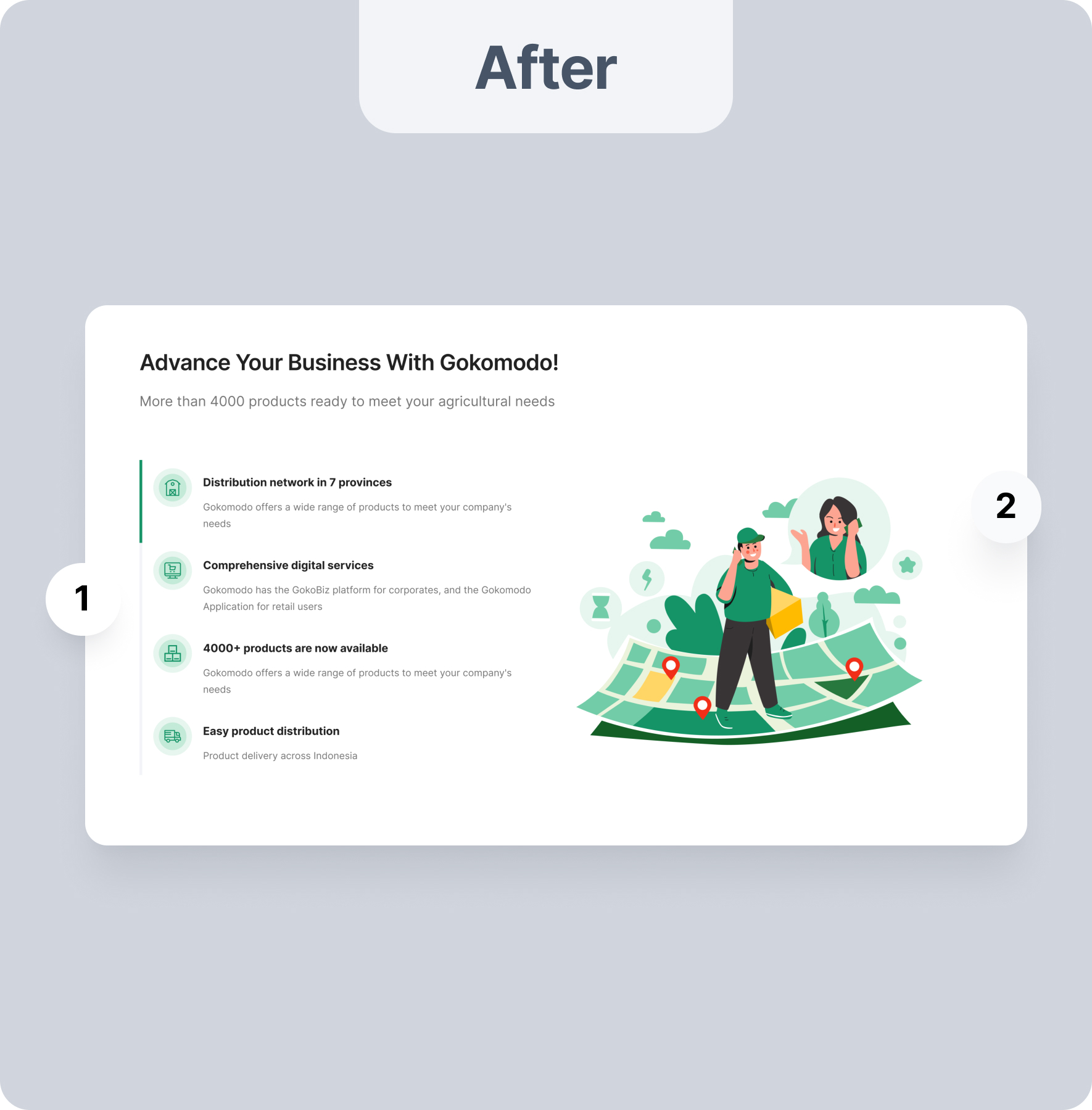Point 1 illustrates the brand and products with clearer visuals and product interactions embedded with the brand. In point 2, simplification involves two solution sections targeting two user segments: Companies and Partner Farmers from Gokomodo.