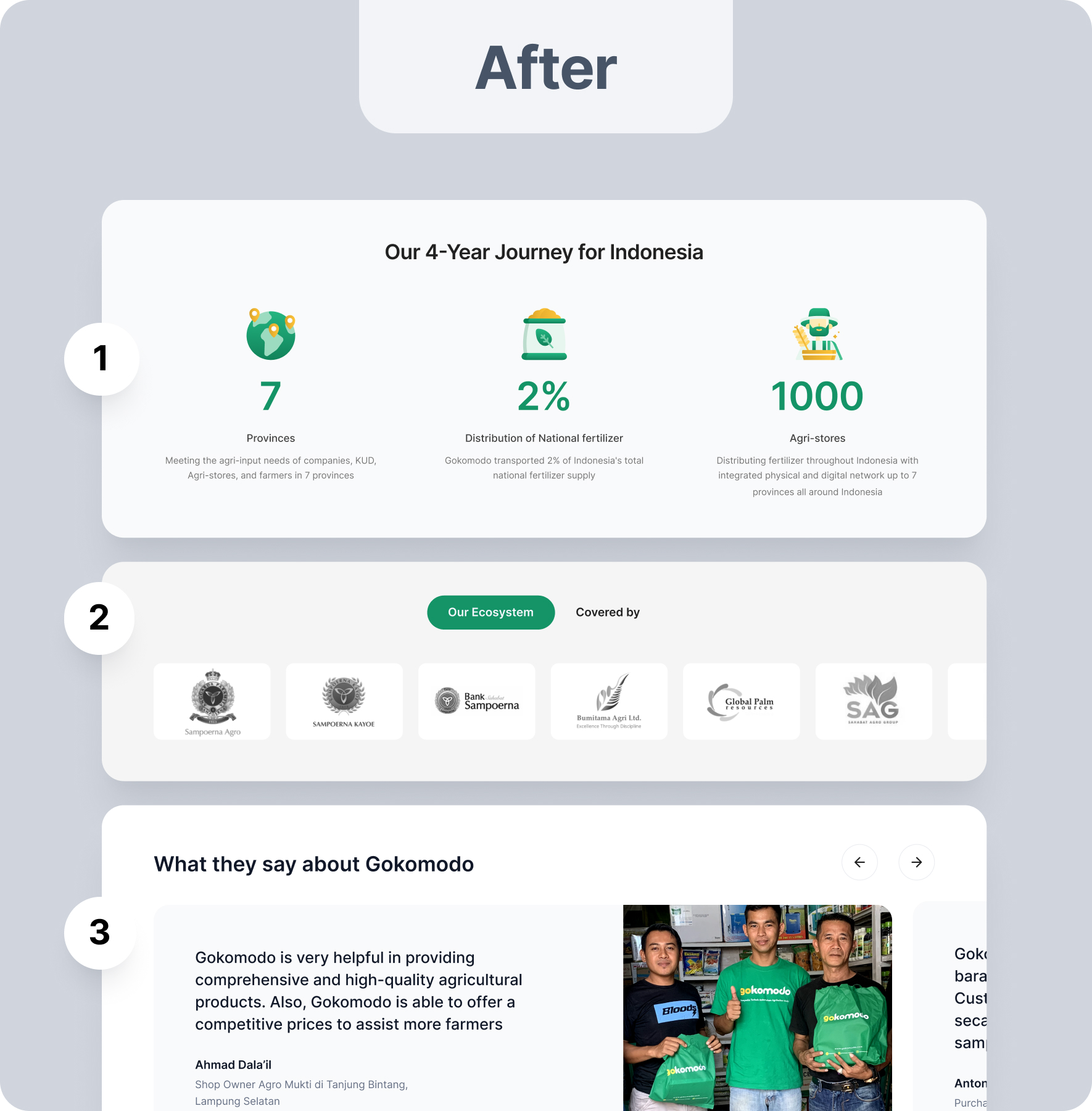 Displaying social credibility in points 1-3 with the impact of Gokomodo nationally, ecosystem, media coverage of Gokomodo, and direct user testimonials.